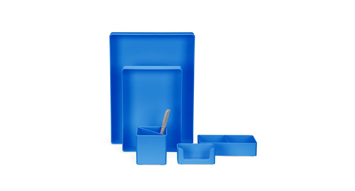 Organize and store loose desktop items with a 6-piece kit available in a variety of colors.