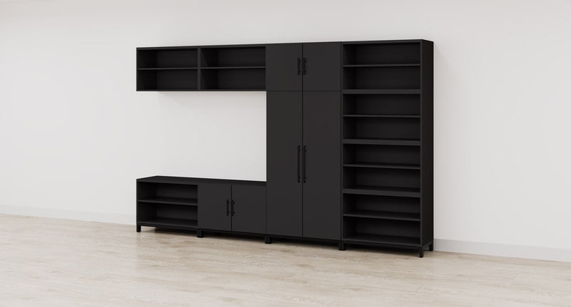 Pre-arranged MoPac Storage System configuration adding extensive storage with stylish and sturdy components that mount directly to the wall.